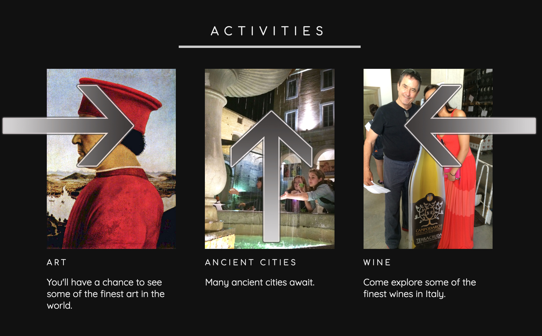 We can do something similar to the next pane (shown left) on the page as well. In this case, the image on the left and right both fade in the same manner as the previous pane, but the middle image fades up.
