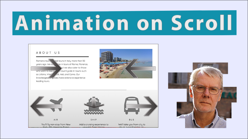 This lesson shows you how to create a site that animates when scrolling to a particular part of the page. We'll use a library called "AOS - Animation on Scroll" to have page elements fade-left, fade-right, fade-in and zoom-in. AOS allows you to use predefined animations such as fades, flips, slides, and zooms.