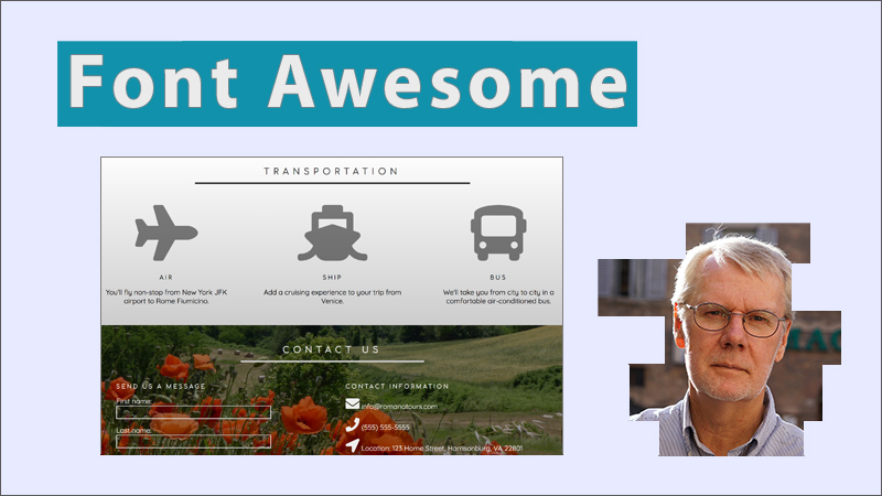 This lesson shows you how to create a page using "Font Awesome." Font Awesome is a toolkit of vector-based icons and social logos you can use for free, or pay a fee for additional icons and features. As vector icons, you can scale the icons to be larger or smaller with no loss in quality.