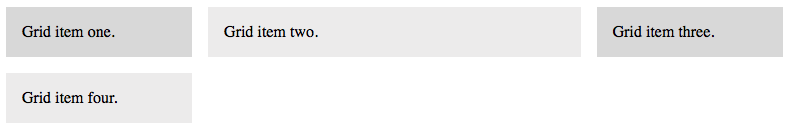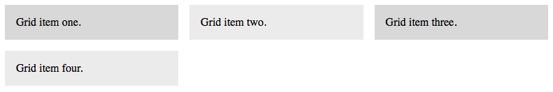 In the example to the left, we've decided to use 3 columns, each using 1 fraction (1fr) of the available space. Notice too that instead of using both grid-column-gap and grid-row-gap, we have instead handled both with the shorthand property grid-gap.The result in a browser is shown below. Notice that with four elements, the fourth box is moved down to the second row.