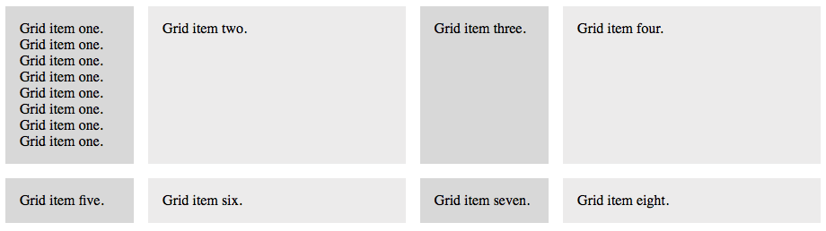 There is also no need to specify a height for any of the grid elements or rows. That's because CSS Grid automatically expands the height of an element (box) to fit the content inside.Notice in the example below that grid item one has expanded its height to accommodate the increased content it holds. The other elements on that row also expand to the same height. This is something that was very difficult to do in the old days of "floated" layouts. (It was referred to as the Holy Grail Layout problem). With CSS Grid, it's a breeze.