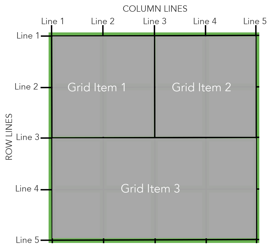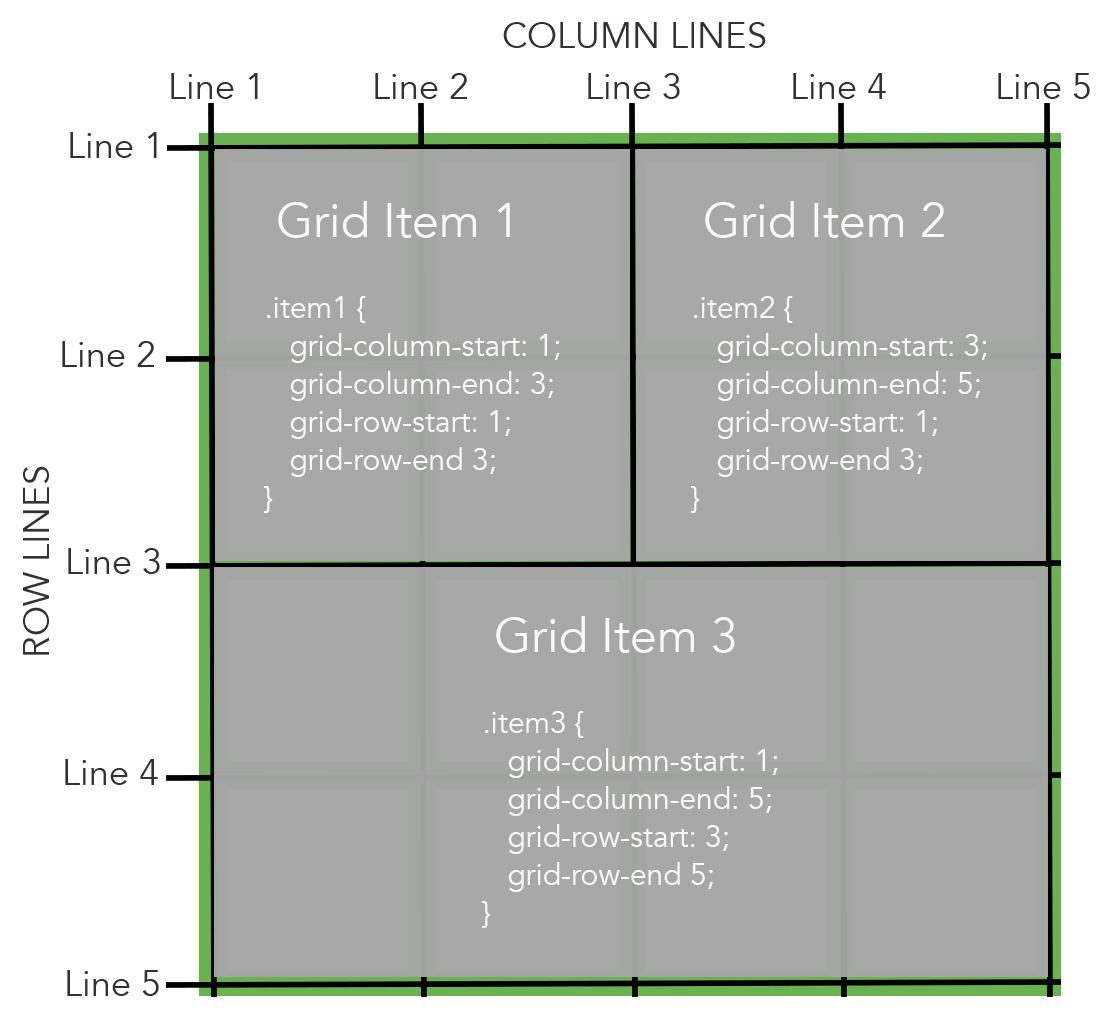 Grid item three starts on column line 1 and ends on column line 5. It starts on row line 3 and ends on row line 5.