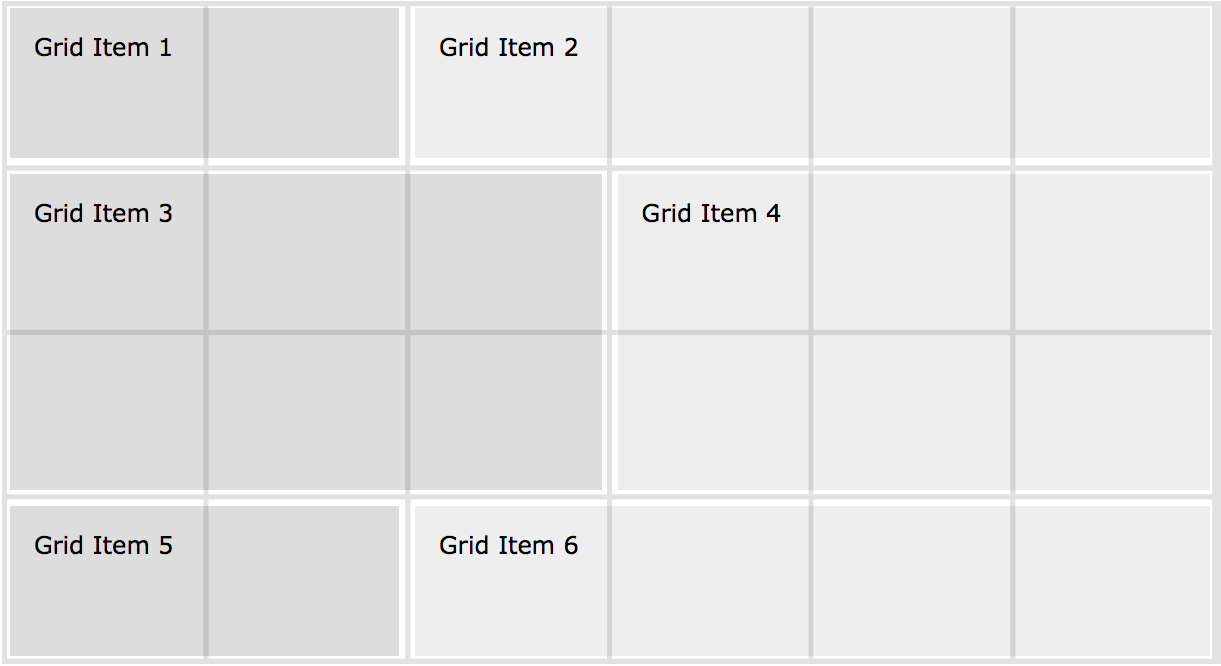 There are six grid items.We'll explicitly state all of the grid columns, but we'll only explicitly create rows when needed (such as for grid items 3 and 4). Otherwise, we'll let the auto-placement algorithm place the grid items on rows implicitly.