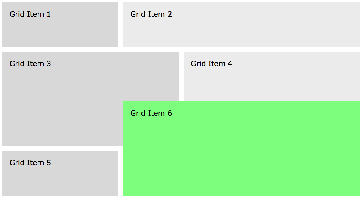 Notice that we did not state the grid rows for most of the elements. Grid items 3 and 4 were designated to take up both rows two and three, so the next grid items (items 5 and 6) were automatically placed onto row four. Here, we have used both the explicit and the implicit grid.