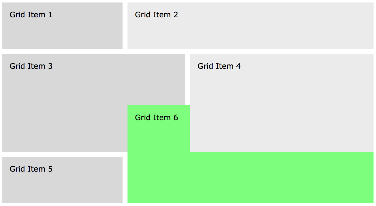 Use the same code as in the previous example, but change the row line numbers for grid item six so that it overlaps grid items three and four. You can do this by adding grid-row: 3/5 to grid item six. (We are also using some CSS to give the grid item a green background for it to stand out).You'll next want to experiment with the stacking order. Put the following declaration into the CSS for grid item four: z-index: 2. Notice that grid item four now stacks on top of grid item six because it has a higher z-index, as shown below.