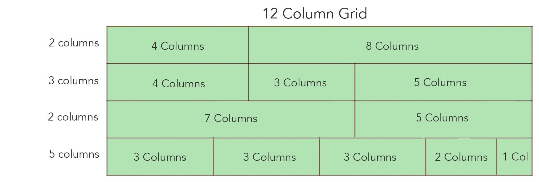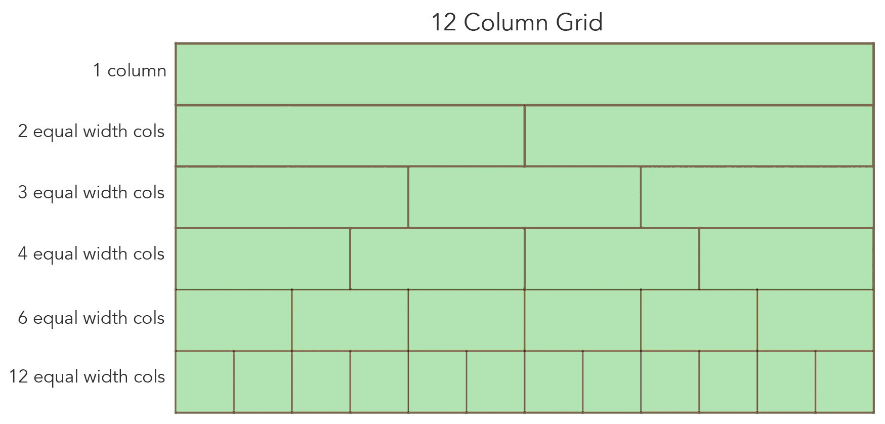 Most frameworks utilize a built-in 12 column grid system for creating responsive layouts. With 12 columns, one can get the greatest number of equal width columns on a row. The grid below shows that it's possible to have 1, 2, 3, 4, 6 and 12 equal width columns with a 12 column grid.