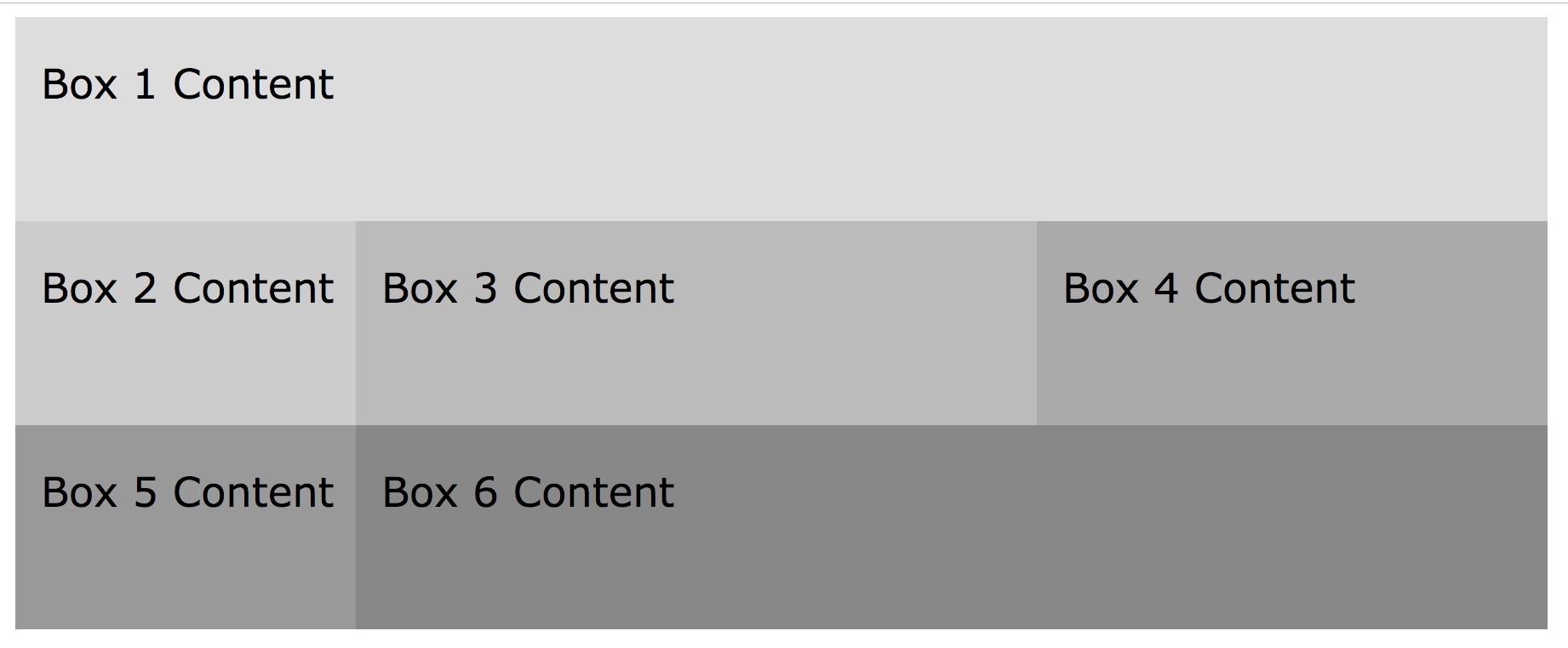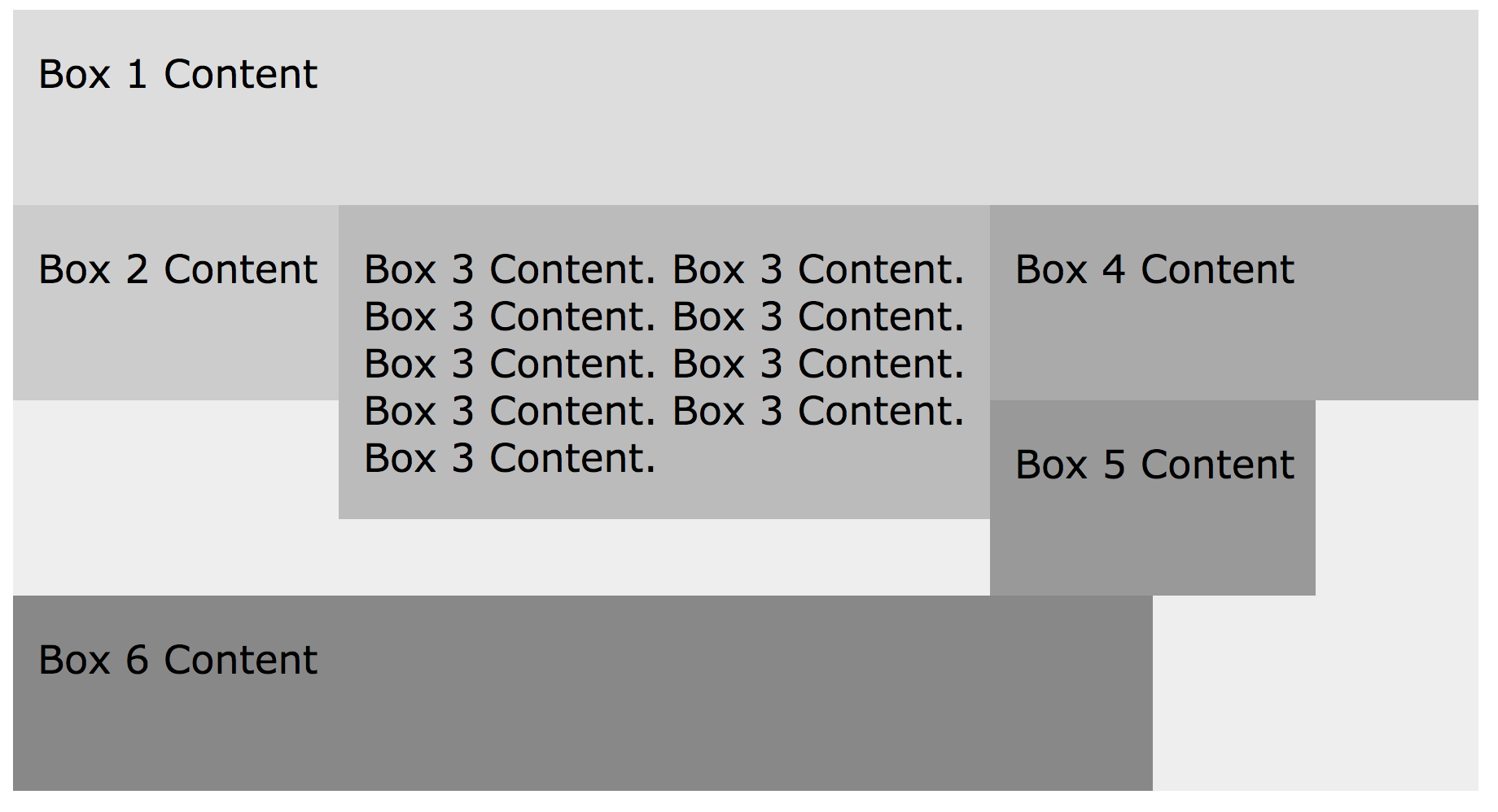 In this example, the container is set to a width of 900 pixels. The nested boxes are all set to float: left. Box 1 is 900 pixels wide, so it exactly fits on the first row and box 2 has to shift down to the next row. Box 2 is 200 pixels wide. Box 3 is 400 pixels wide, and Box 4 is 300 pixels wide. Together, boxes 2, 3, and 4 are 900 pixels wide, so they all fit together on the second row. Box 5 doesn't fit, so it moves down to the bottom row. It is 200 pixels wide. Finally, box 6 is 700 pixels, so it takes up the remaining space on the bottom row.
