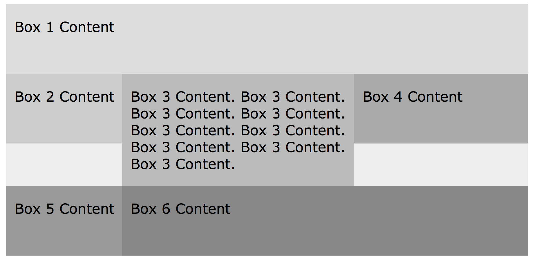 Fixing the hanging floats requires that you clear the float on the element that is getting hung up. So, we have to add clear: left or clear: both to the <div> for box 5. Now, it goes all the way down to the next row and starts on the left side of the layout.