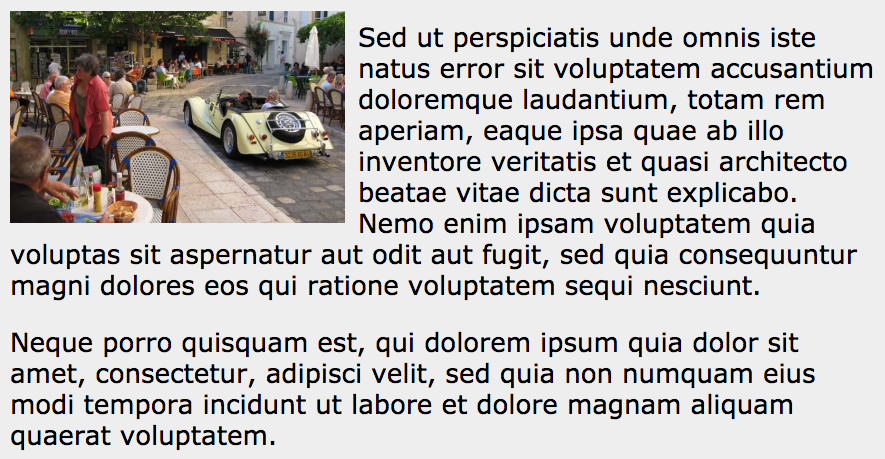 Absolute and relative positioning are useful for aligning some elements, but are limited in their ability to effectively control layout for an entire page.The float property was initially intended to allow text to align to the side of an image and to wrap underneath when the text block is taller than the image. Values include left, right, none, or inherit, though the most common are left and right. The image below shows how floats were intended to be used. In this case, the image is floated to the left with float: left being applied to the image.
