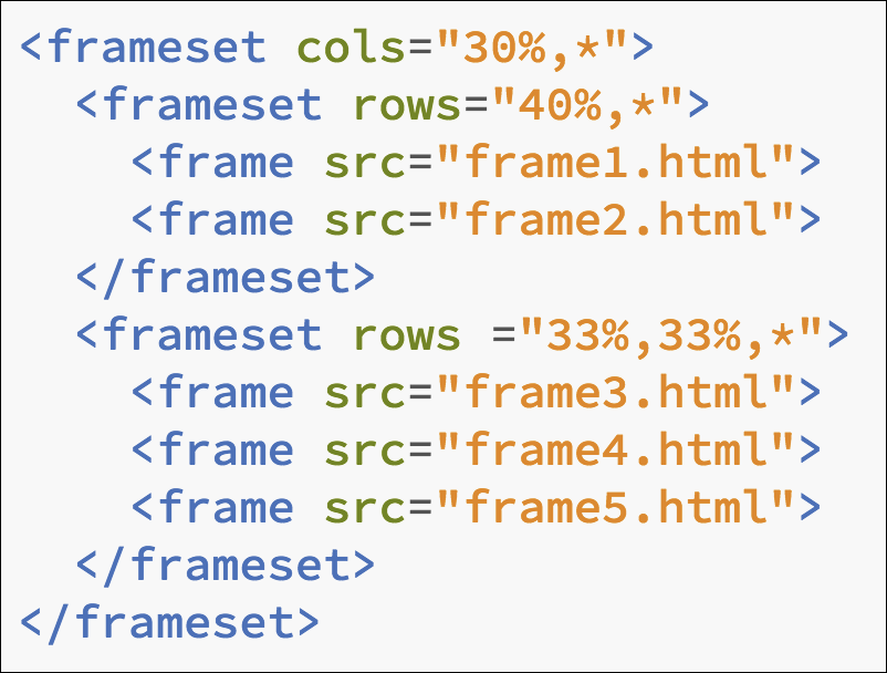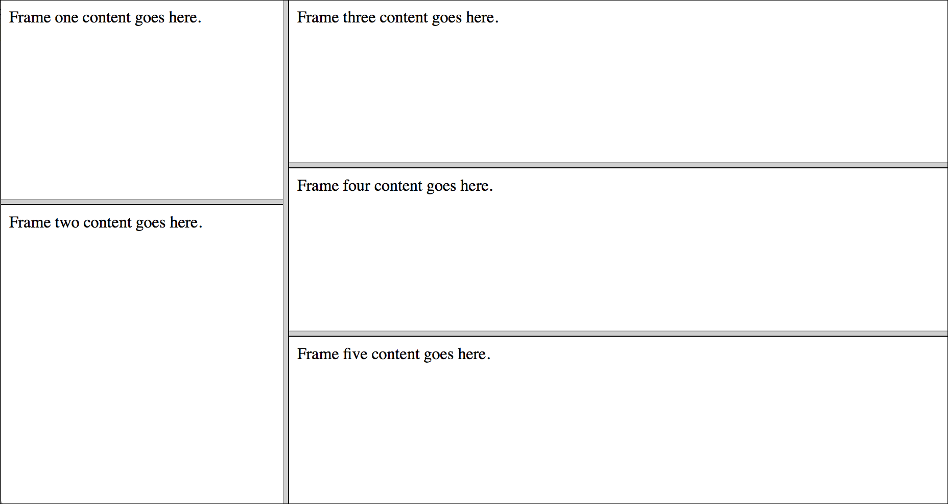 Of course, this system meant that developers had to manage multiple files for just one layout. Frames were problematic for other reasons as well. Bookmarking framed pages didn't work well, there was often confusion about sending people links to framed pages, and they weren't search engine friendly. Like tables, using frames for layout broke the intention of the web to keep structure and presentation separate.