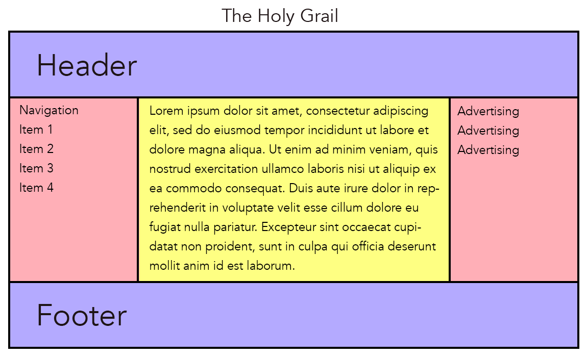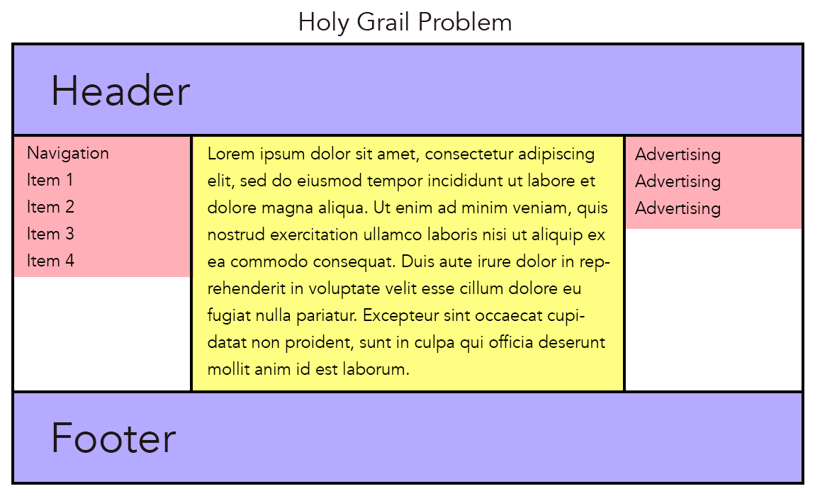 One of the problems Flexbox (and CSS Grid) solved was something known as Holy Grail Layout (The problem was so great, it became like trying to find the Holy Grail). Creating equal height columns on the same row with different amounts of content had challenged web designers for years. It was easy to do in the days of table-based layout, but tables were difficult to maintain and were not semantic. Before Flexbox, all known solutions had drawbacks. Solutions included divs with table-property displays, absolutely positioned divs, and JavaScript hacks.