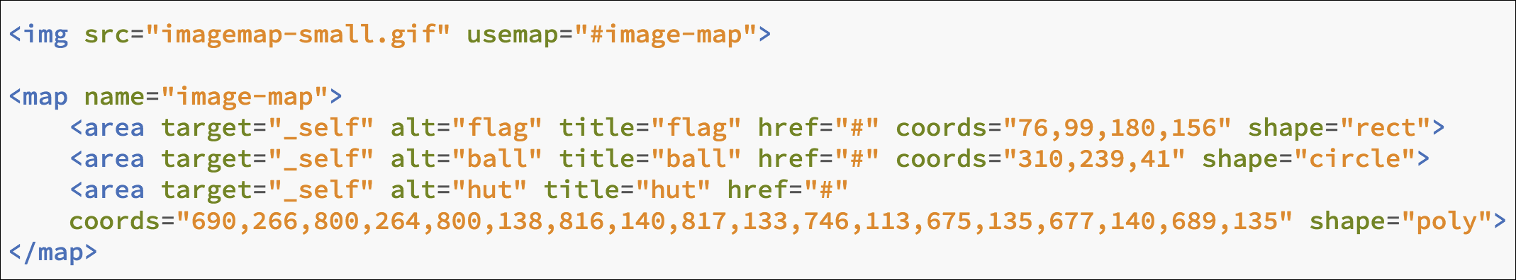 The image below has mapped out coordinates for a rectangle (the flag), a circle (the beach ball), and a polygon (the beach hut). These hotspots could then be linked to other pages such as shown with the code below.