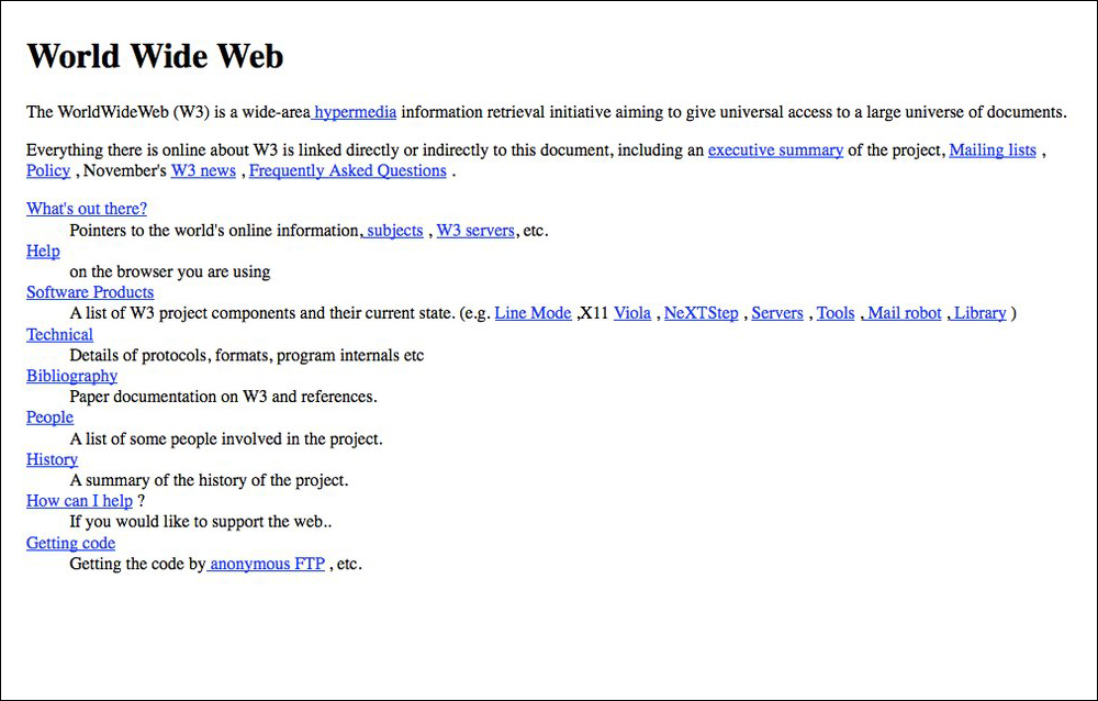 An early website (from 1992) can be seen below and at: http://info.cern.ch/hypertext/WWW/TheProject.htmlUsing HTML to control layout soon became a huge problem for web developers to maintain pages. Changes would have to be made in multiple instances on multiple pages of a site. Plus, founders of the web, such as Tim Berners-Lee, had envisioned HTML to be used only to define the structure of a document, not to control presentation.