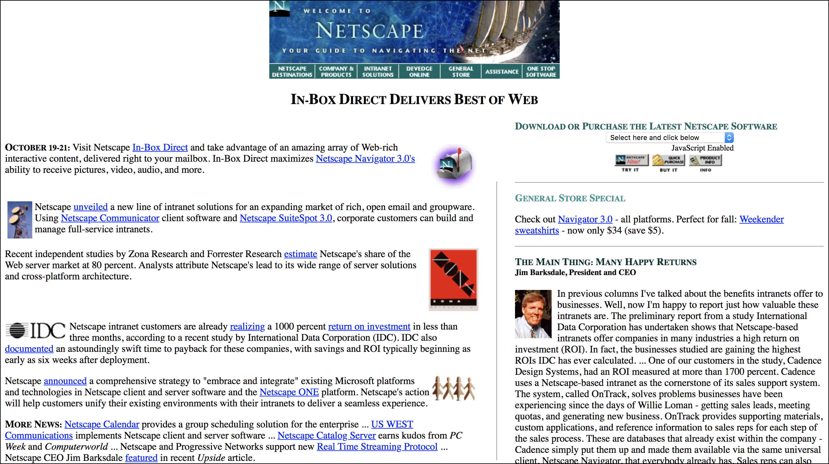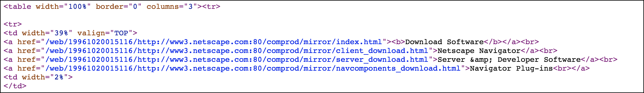 An early Netscape site shows the use of a table for layout.